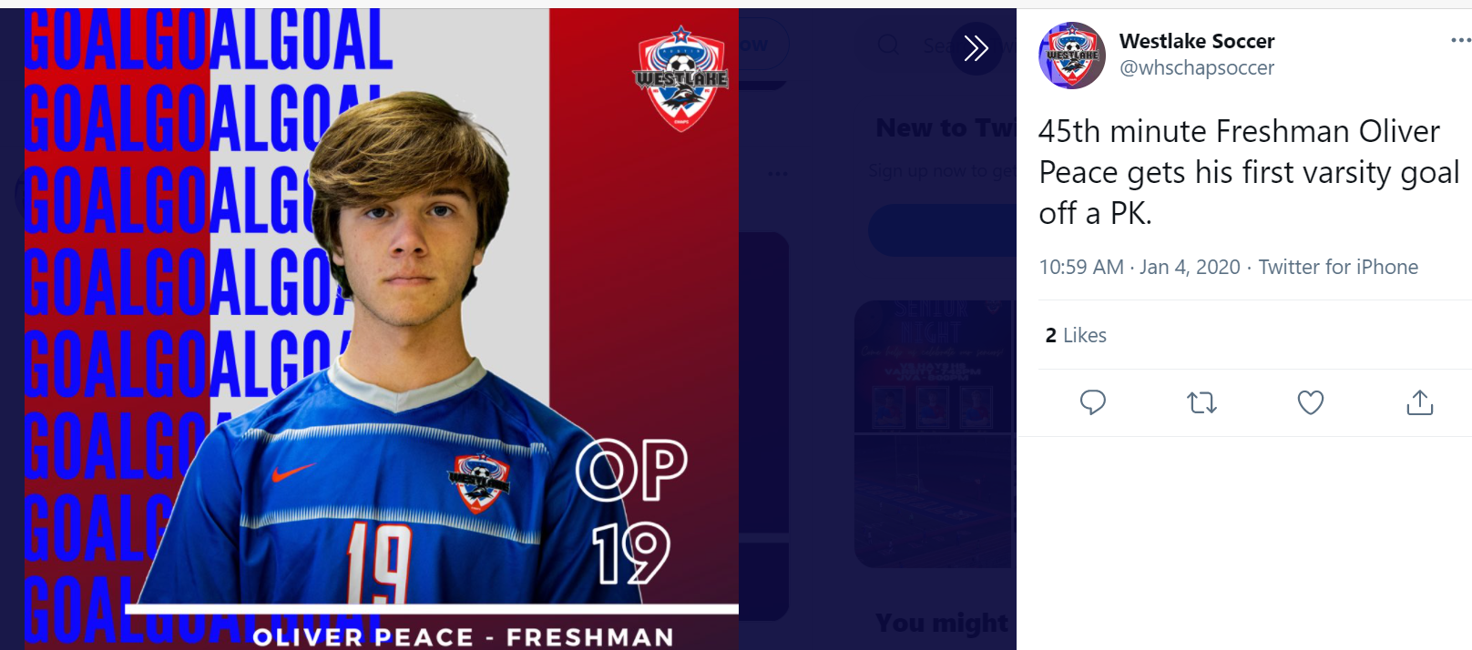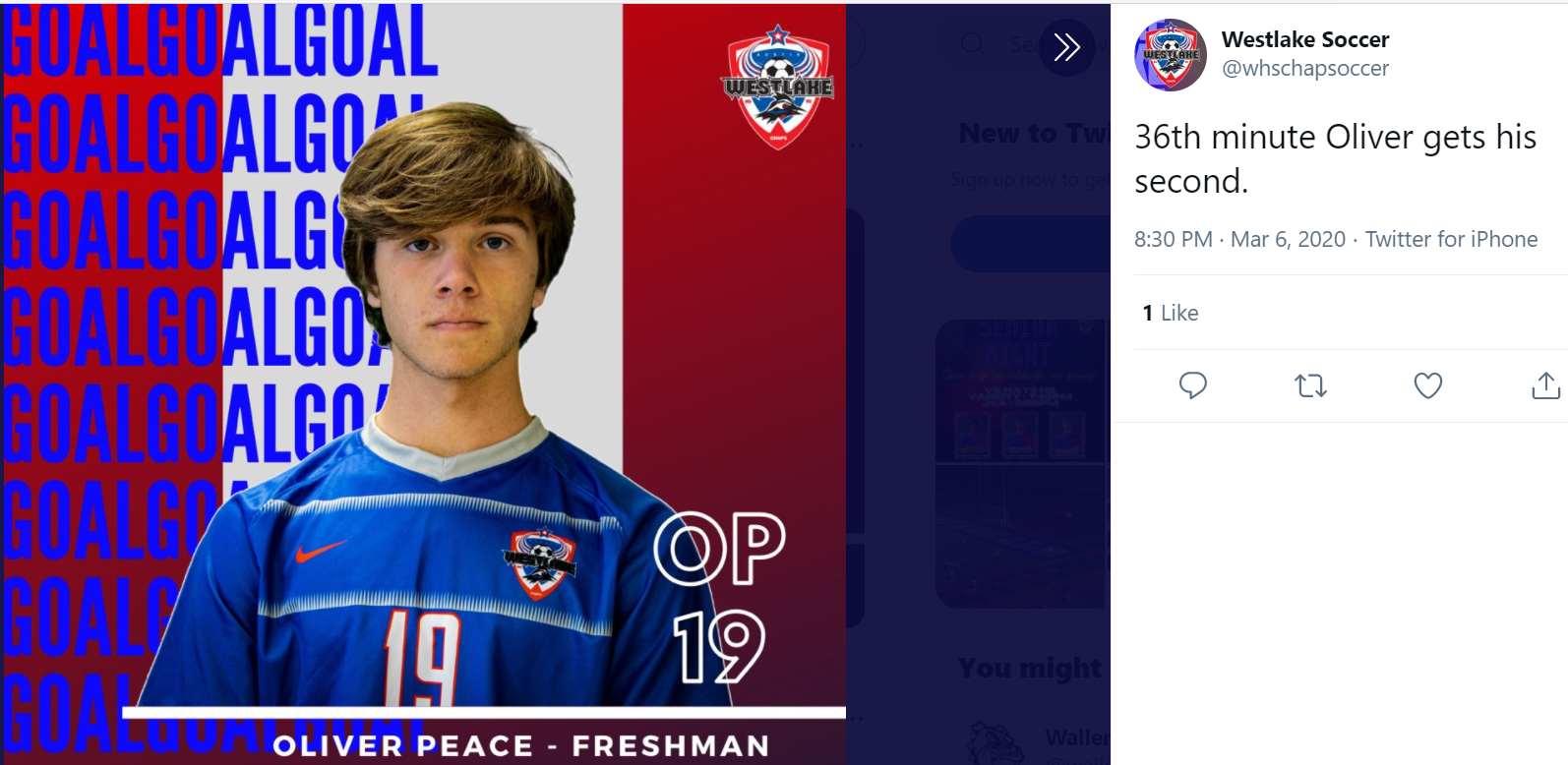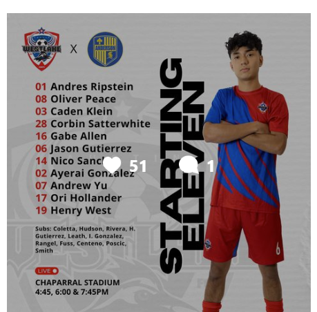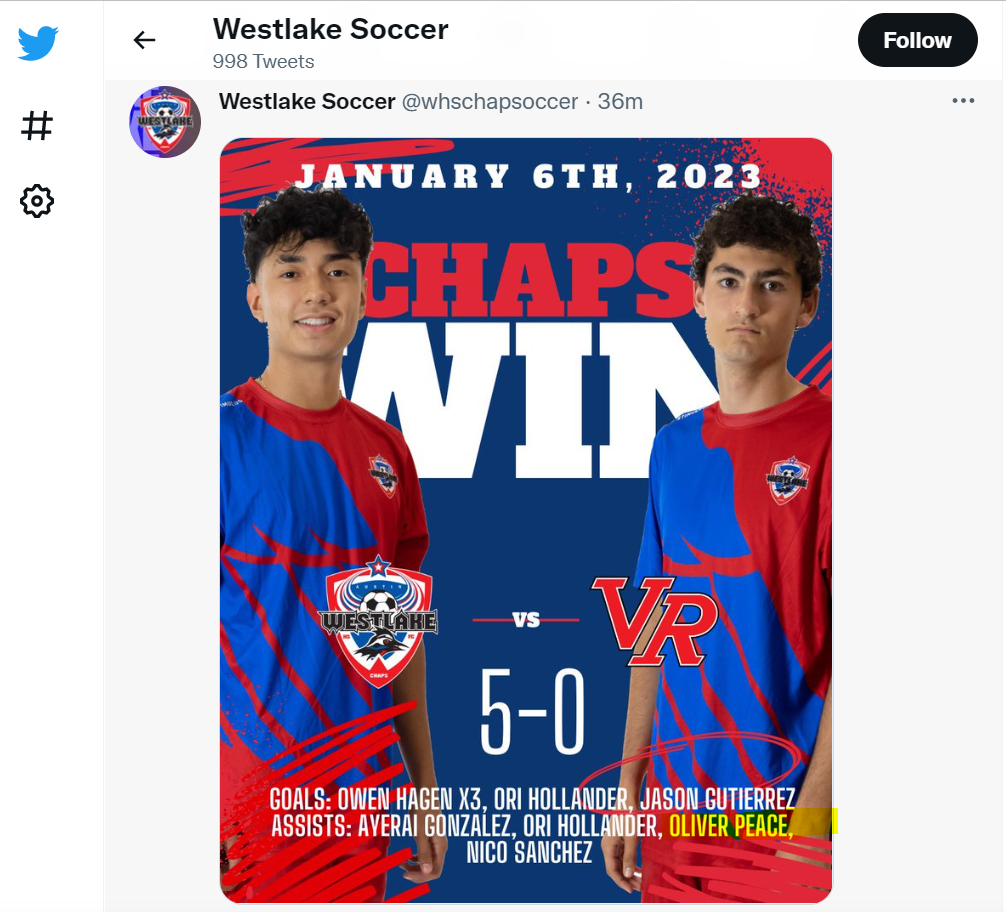 Westlake Men’s Soccer Instagram - Oliver Peace goal and 2 assists