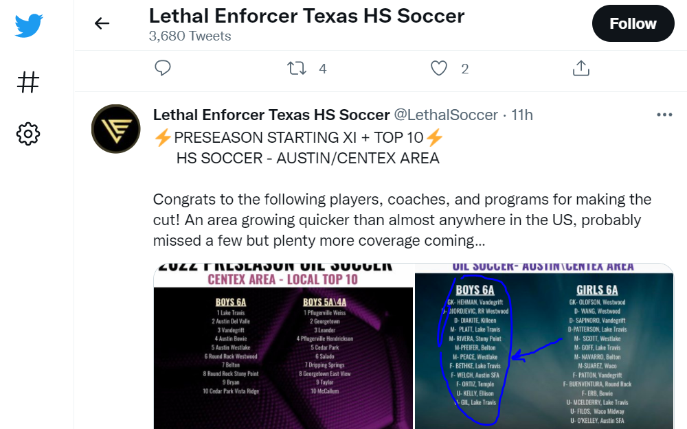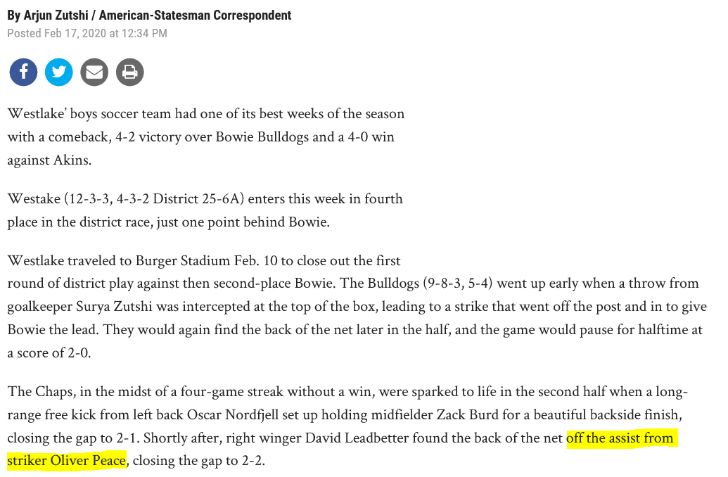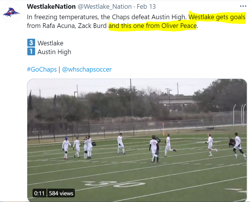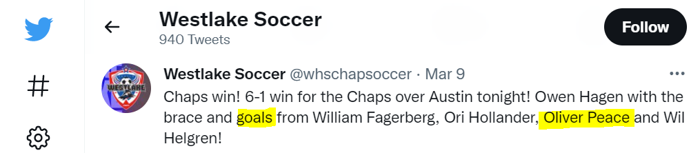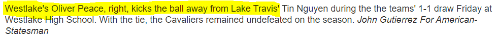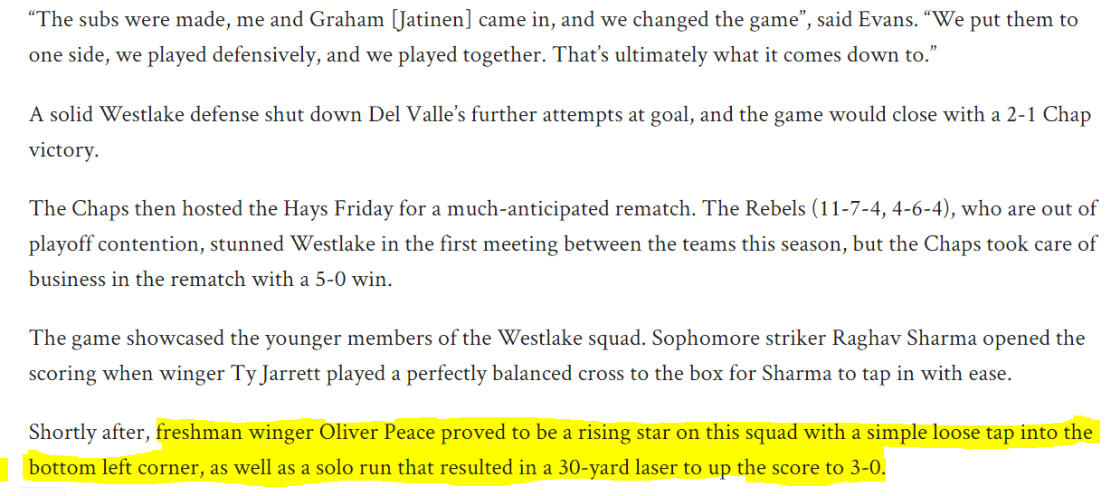 Westlake Men’s Soccer Instagram - Oliver Peace assist (along with his brother, captain Arnie Peace)