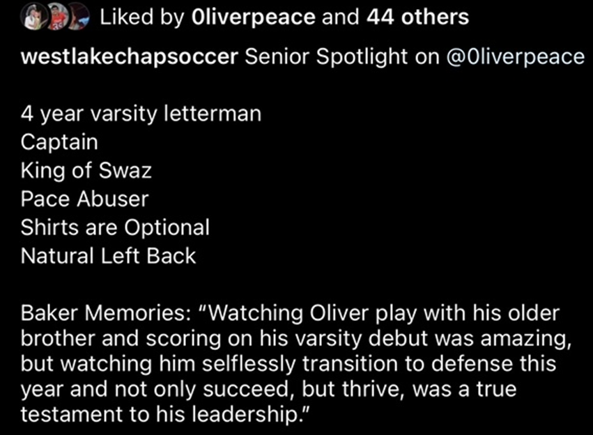 Westlake Men’s Soccer Instagram - freshman, Oliver learned so much from captain, big brother and 2019-2020 All District Player Arnie Peace
